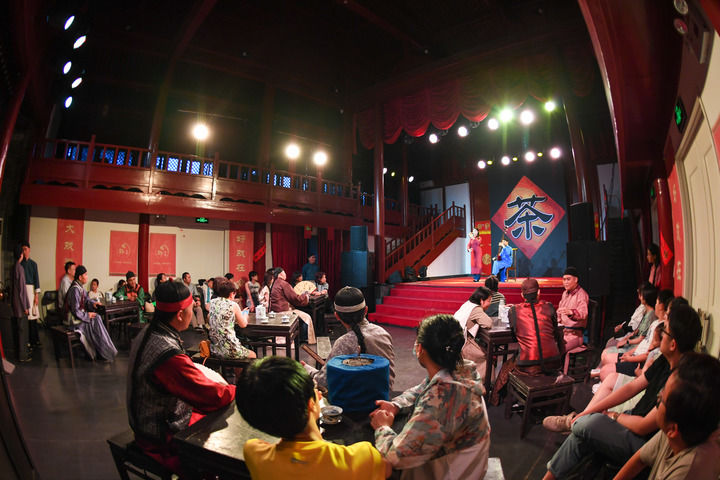 2024年7月7日,在北京市东城区颜料会馆,观众在欣赏由北京市曲剧团演员带来的沉浸式北京曲剧《茶馆》。新华社记者 鞠焕宗 摄