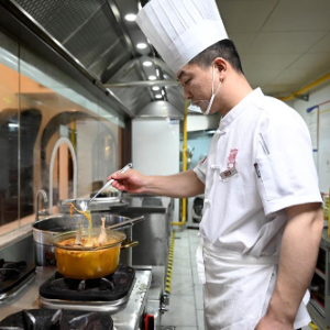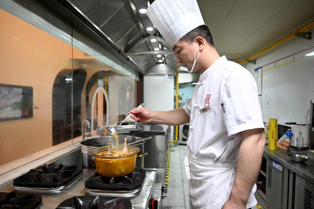 5月7日,在安徽省亳州市一家药膳餐厅,药膳制作师在制作药膳。新华社记者黄博涵 摄