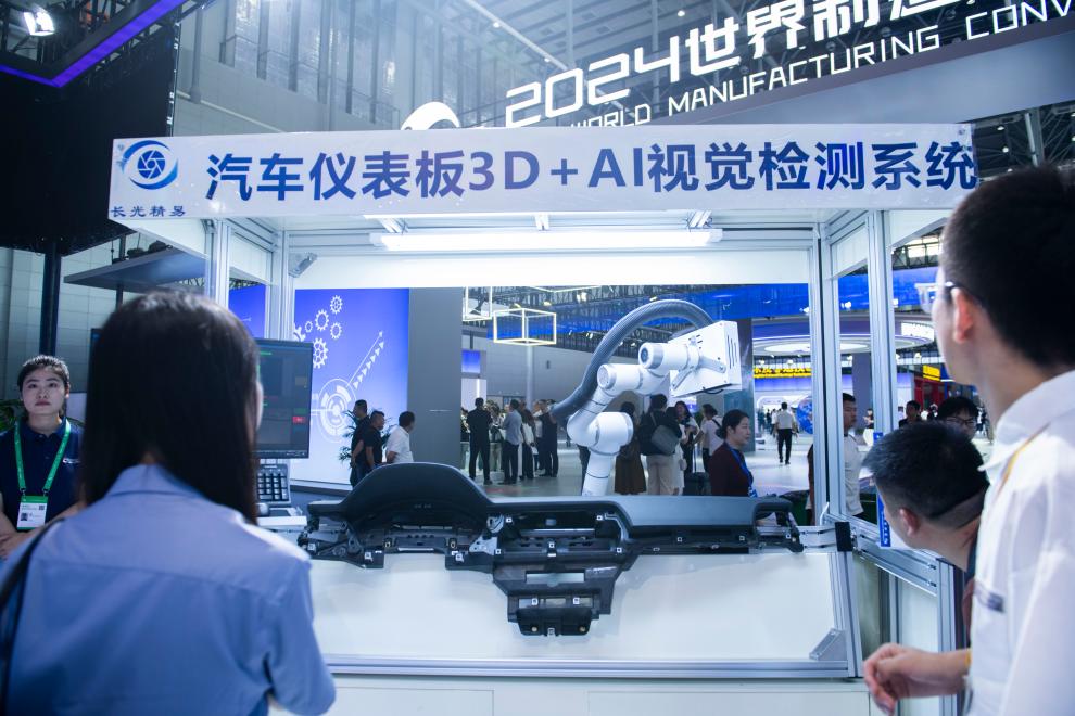 9月20日,观众在2024世界制造业大会展馆内了解汽车仪表板3D+AI视觉检测系统。新华社记者 傅天 摄