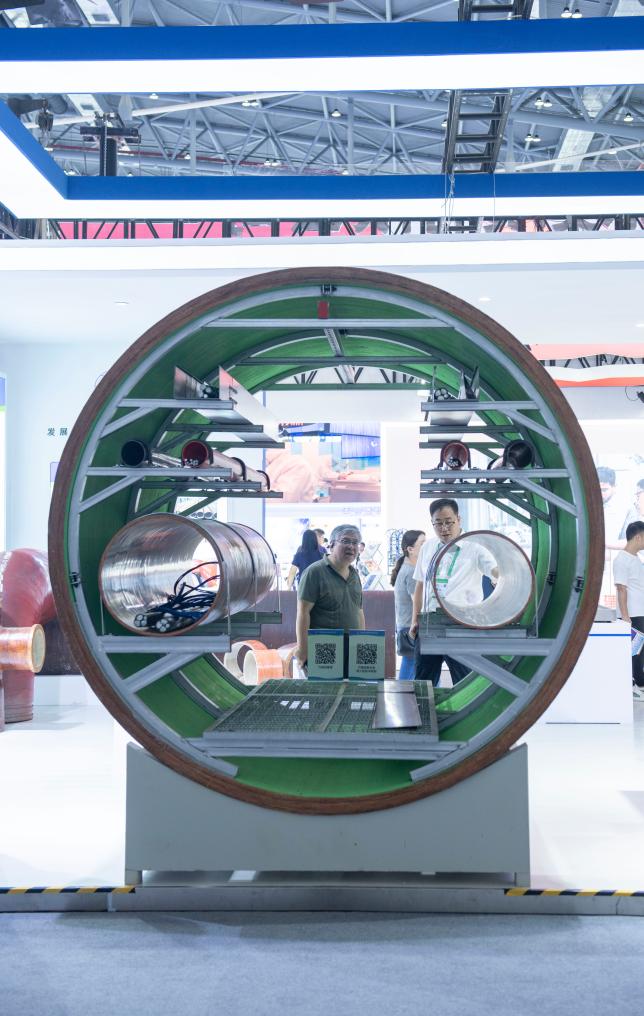 9月20日,观众在2024世界制造业大会展馆内了解一款竹缠绕管廊。新华社记者 傅天 摄
