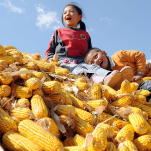 2008年9月30日,两名小朋友在黑龙江省绥化市东富乡东升村的玉米堆上玩耍。 新华社记者 徐家军 摄