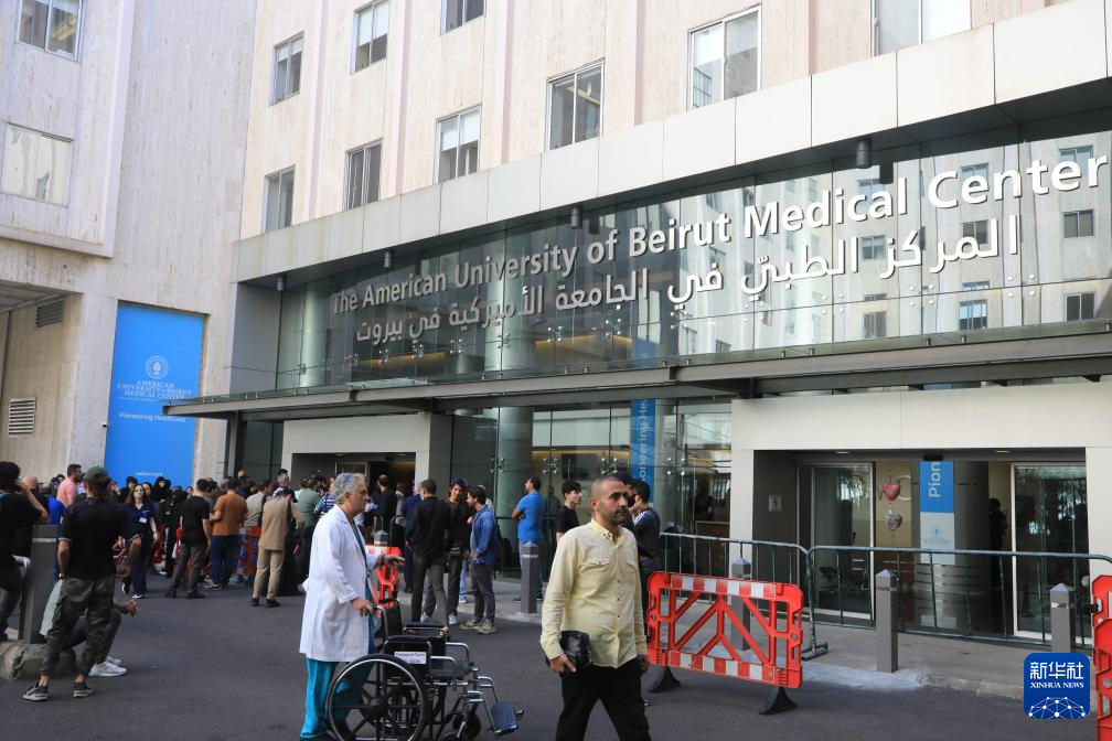 9月20日,在黎巴嫩首都贝鲁特,人们聚集在贝鲁特美国大学医疗中心门口。新华社记者 程帅朋 摄
