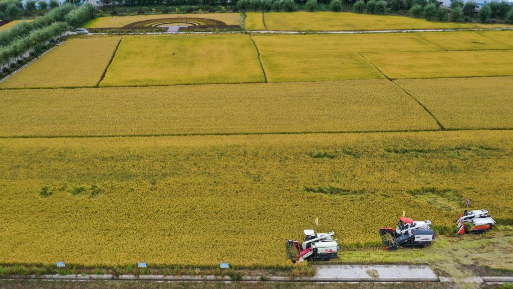 9月20日,在位于吉林省永吉县一拉溪镇的九月丰家庭农场金秋开镰仪式现场,农民驾驶农机进行水稻机械化收割展示(无人机照片)。新华社记者 张楠 摄