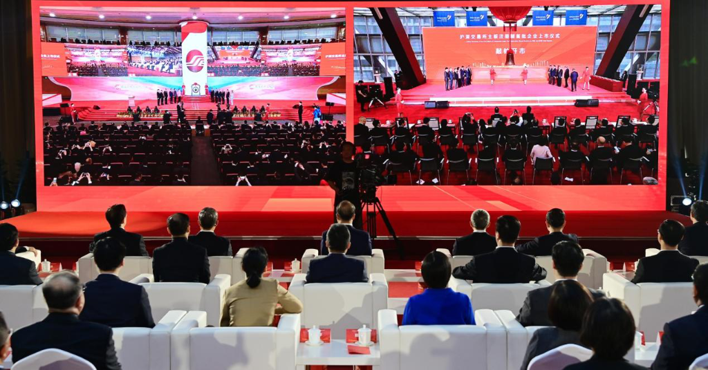 2023年4月10日,在沪深交易所主板注册制首批企业上市仪式北京分会场,与会嘉宾通过屏幕实时观看沪深两地交易所上市仪式。新华社记者李贺 摄