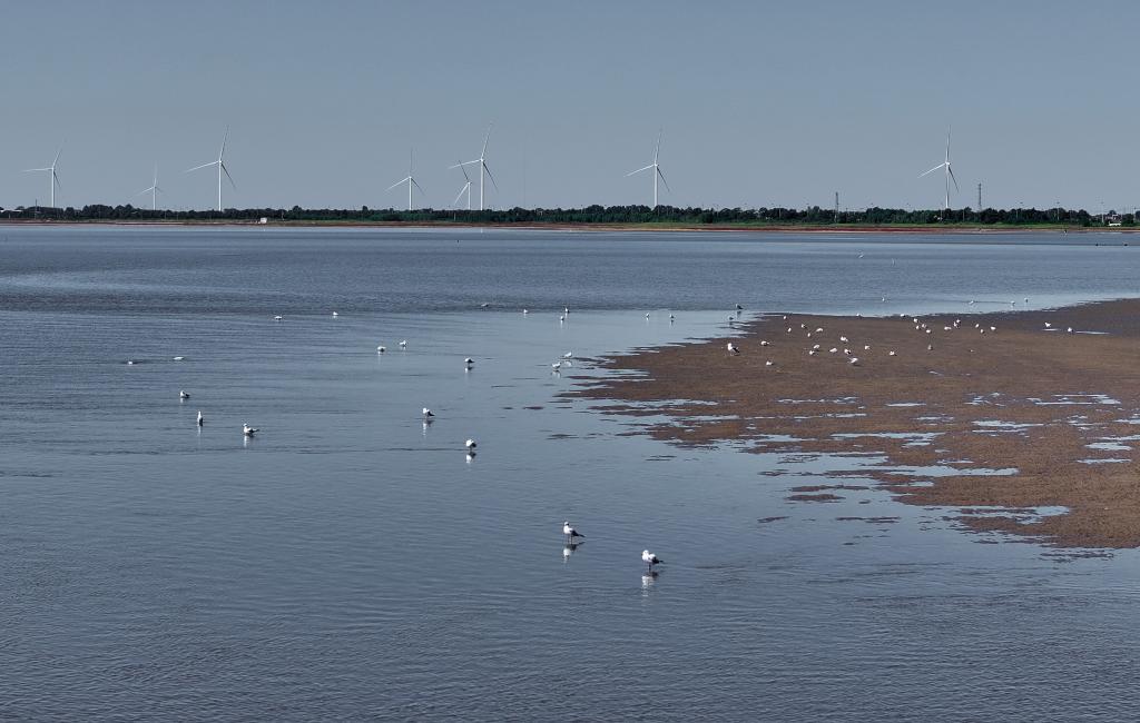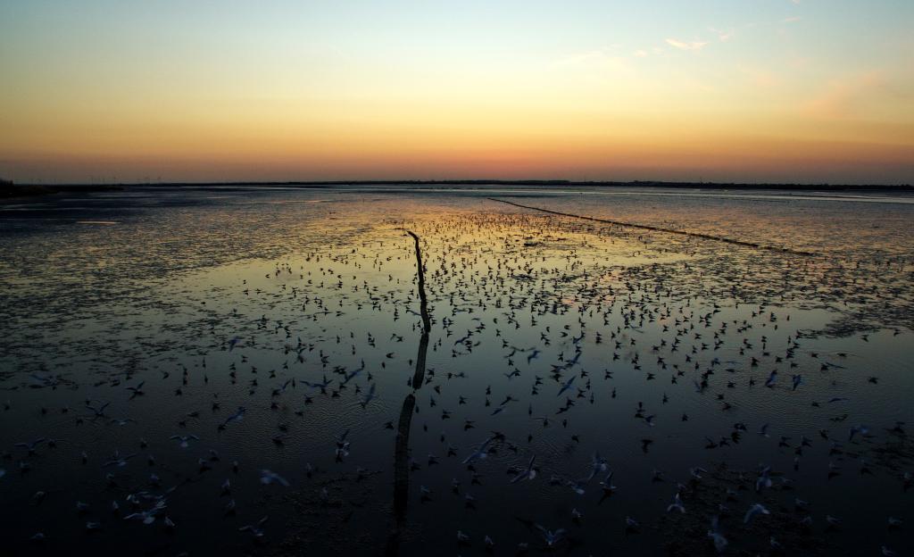 9月21日,一群水鸟在秦皇岛市北戴河新区七里海潟湖湿地觅食(无人机照片)。