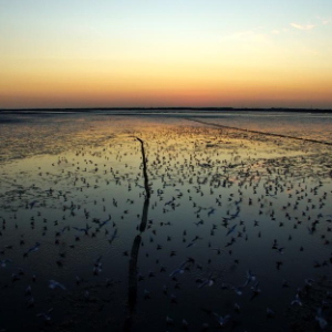 2016年11月7日,一群水鸟在秦皇岛市北戴河新区七里海潟湖湿地觅食(无人机照片)。