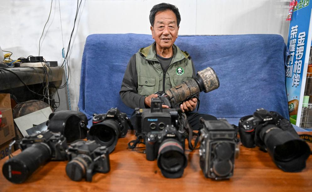 9月20日,费明健在秦皇岛市北戴河新区家中展示自己用过的相机。