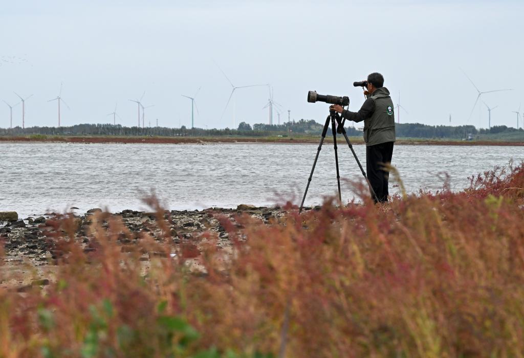 9月20日,费明健在秦皇岛市北戴河新区七里海潟湖湿地用望远镜观察鸟类活动情况。