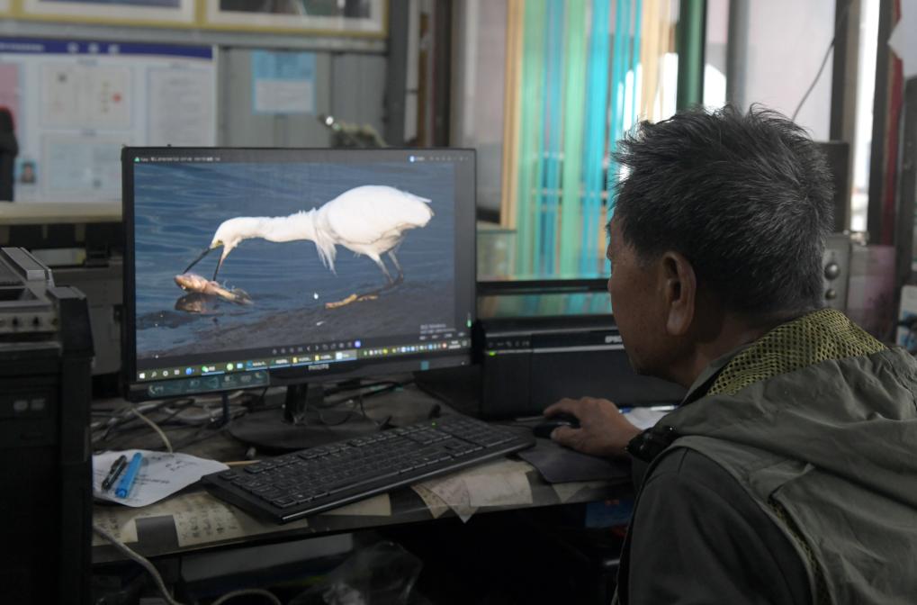 9月20日,费明健和妻子在家里整理拍摄到的鸟类照片。