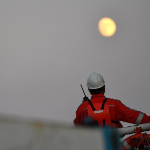 9月17日,在渤海油田曹妃甸6-4油田海上平台,郑建国完成检修工作后擦汗。