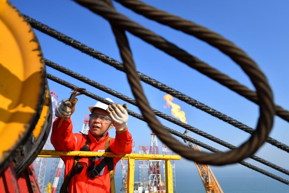 9月17日,在渤海油田曹妃甸6-4油田海上平台,郑建国检查吊车钢丝绳。