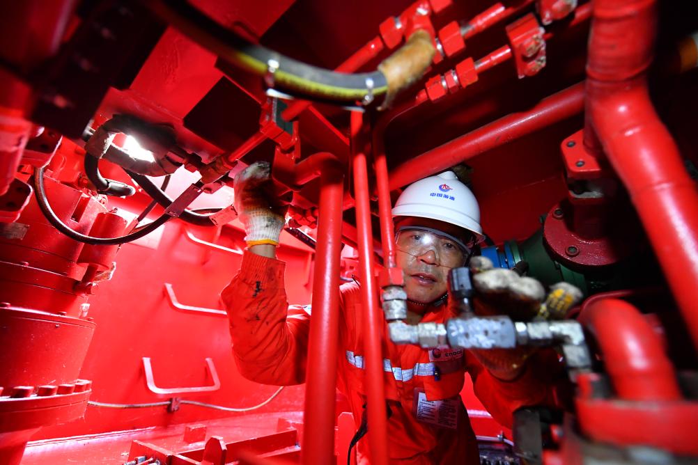 9月17日中秋夜,在渤海油田曹妃甸6-4油田海上平台,郑建国在检查设备运行状况。