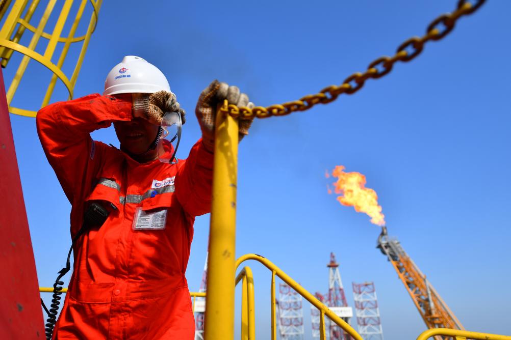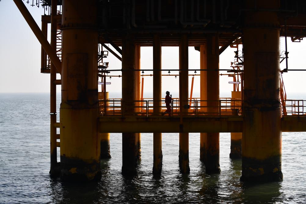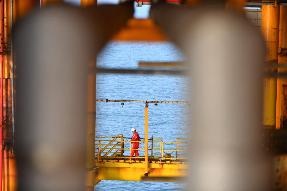 9月17日清晨,郑建国在渤海油田曹妃甸6-4油田海上平台巡查。