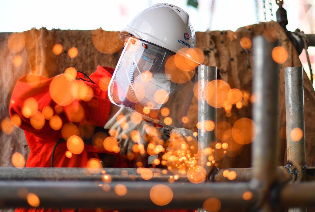 9月17日,在渤海油田曹妃甸6-4油田海上平台,郑建国在制作工件。
