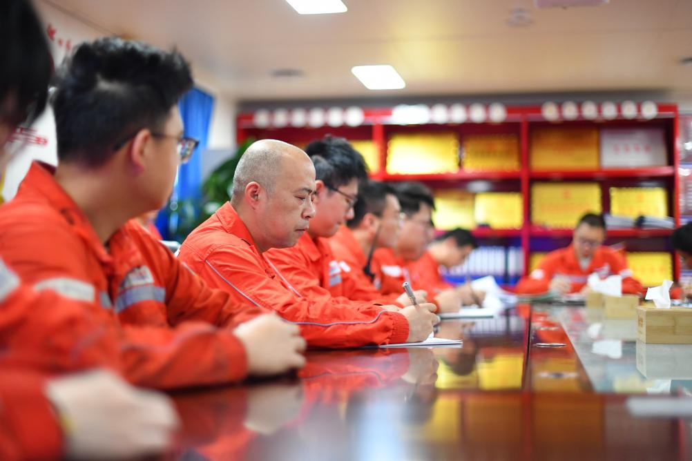 9月18日,在渤海油田曹妃甸6-4油田中心平台,郑建国在早会上记录当天重点工作。