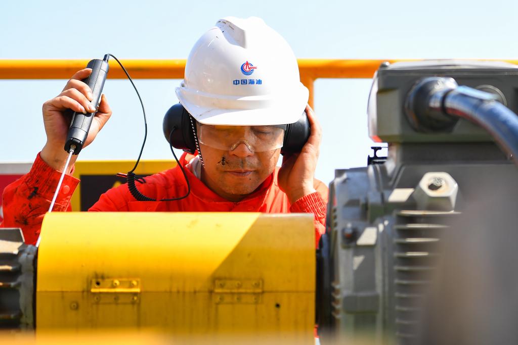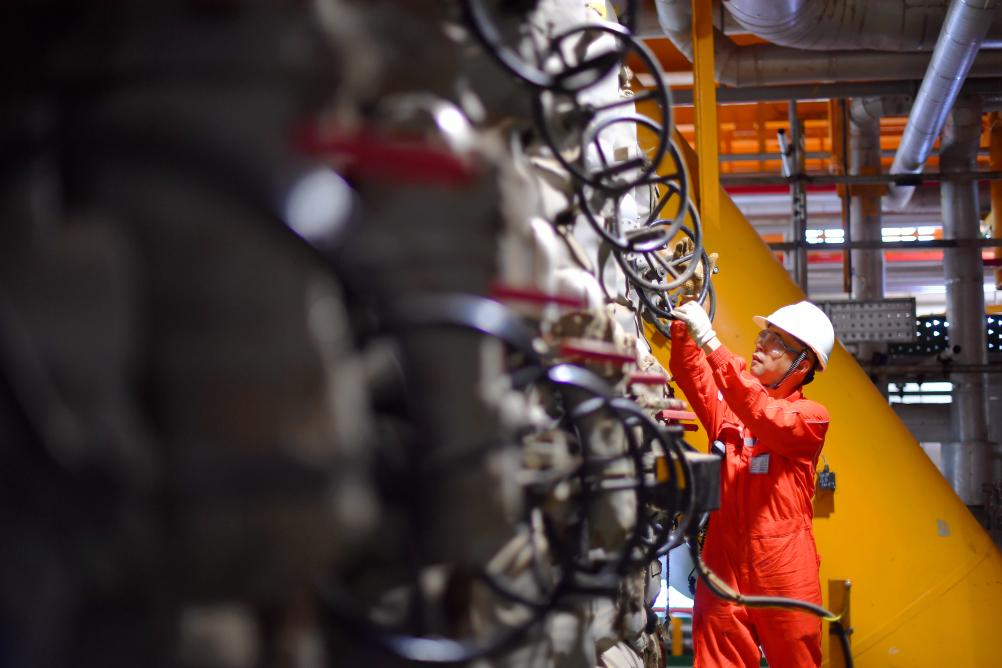 9月17日,在渤海油田曹妃甸6-4油田海上平台,郑建国检查设备流程。