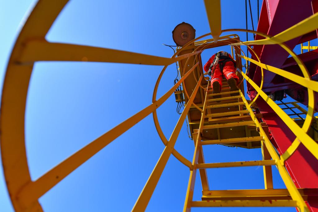 9月17日,郑建国在渤海油田曹妃甸6-4油田海上平台上攀登直梯。