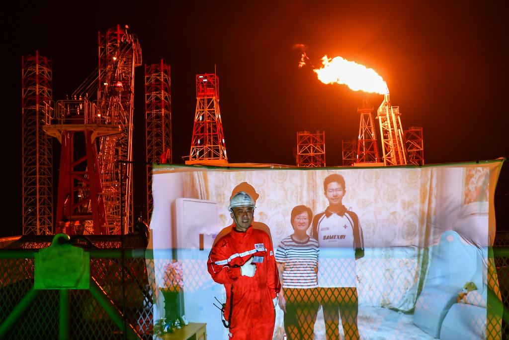 9月17日中秋节,在渤海油田曹妃甸6-4油田中心平台,机修工郑建国(左)与家人的投影一起拍摄全家福。