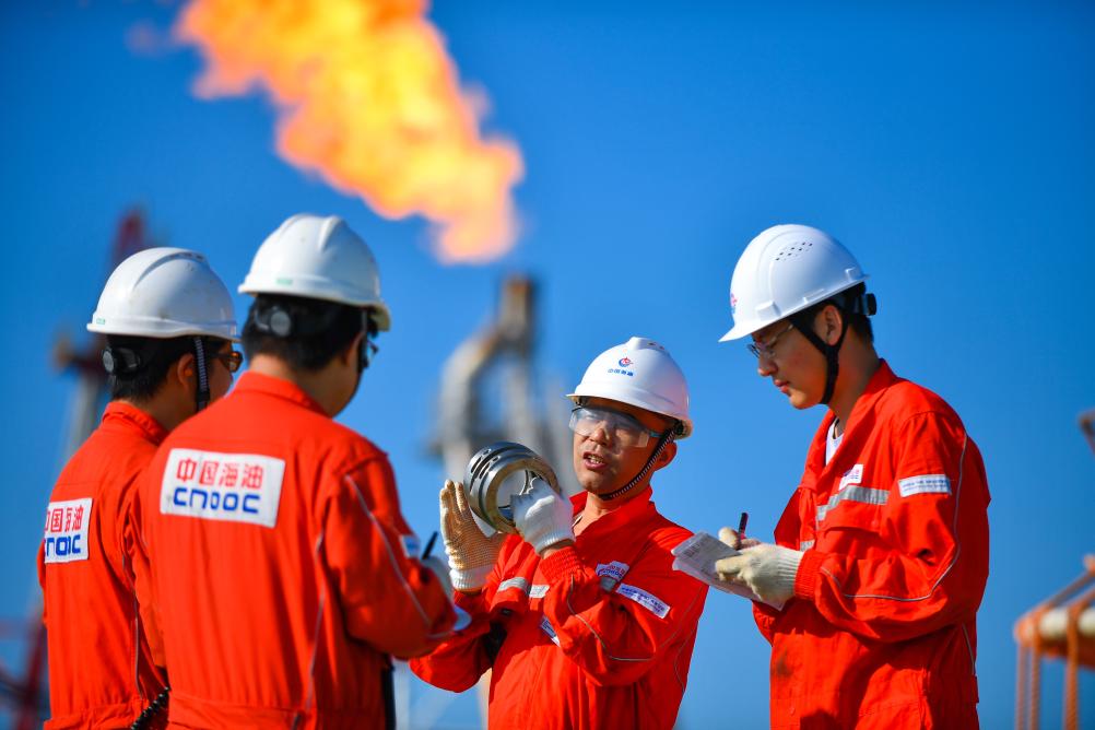 9月17日,在渤海油田曹妃甸6-4油田中心平台,郑建国(右二)与同事分享设备检修经验。