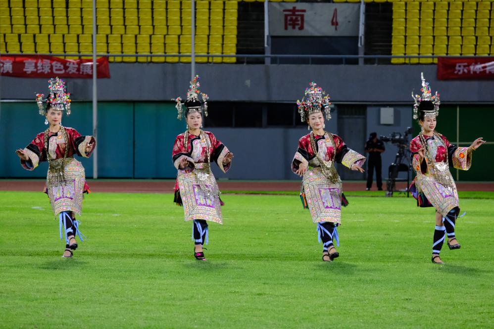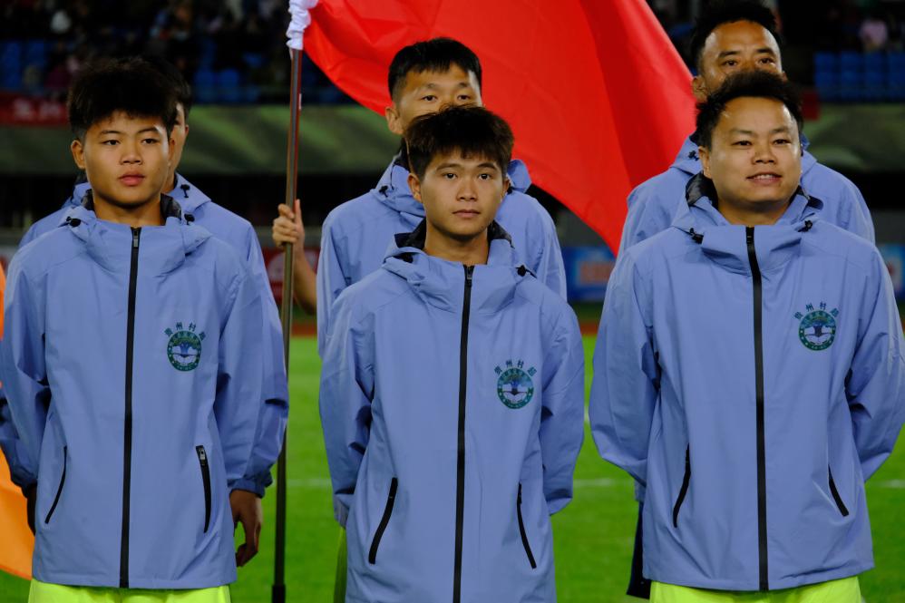 9月21日,榕江罗汉果队球员陆金福(前中)和队友参加开幕式活动。(新华社记者夏子麟 摄)