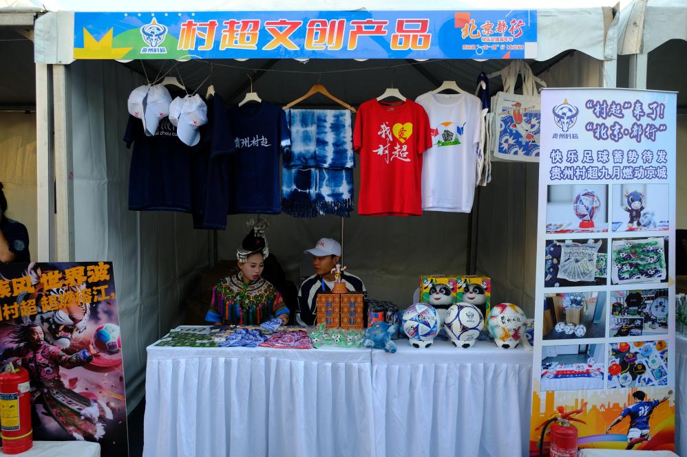 村超“一带一路”行(北京站)活动的“乡村振兴足球文化嘉年华”带来了丰富的“村超”特色周边产品。(新华社记者夏子麟 摄)