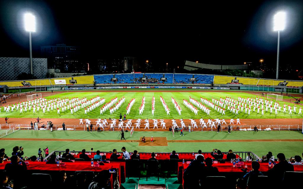 9月21日晚,“北京·都行”快乐足球嘉年华开幕式上的《古韵扇极》表演。