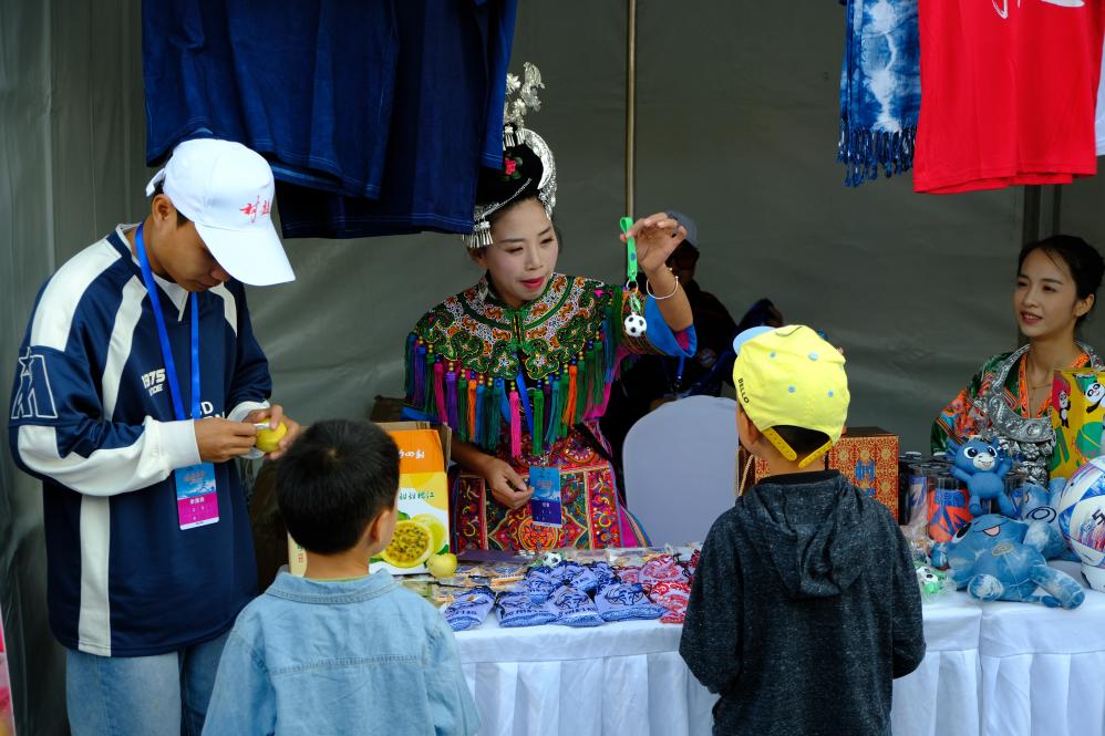 “乡村振兴足球文化嘉年华”上,观众选购贵州“村超”特色周边产品。(新华社记者夏子麟 摄)