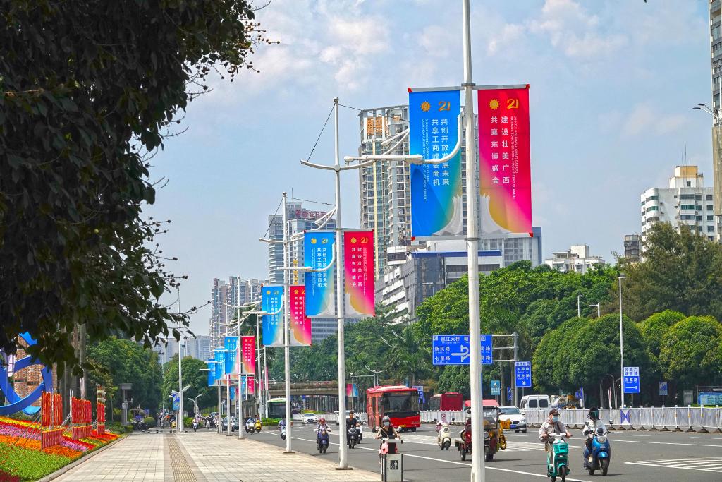 行走在南宁街头,可见各式东博会和峰会的元素。今年的盛会以“亲诚惠容同发展,镶钻成冠创未来”为主题,会期持续至28日,展览规模近20万平方米,参展企业超3000家。