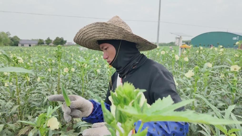 上海小生蔬菜专业合作社的采摘工正在采摘成熟的秋葵。(采访对象供图)