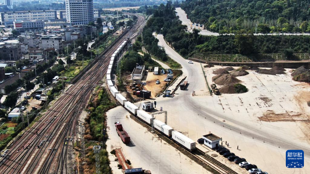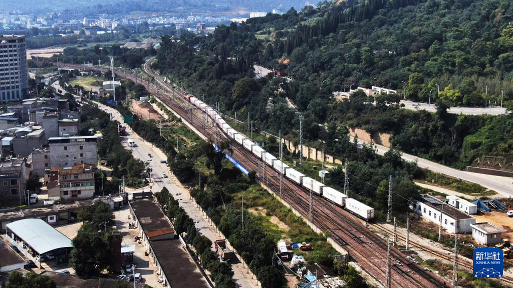 9月24日,首趟中老泰多式联运“一单制”货运列车驶离昆明腾俊国际陆港公铁联运中心(无人机照片)。新华社记者 孙敏 摄