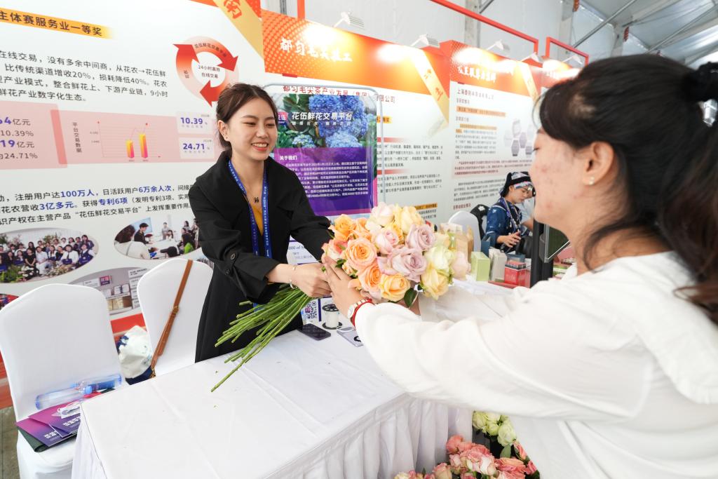 9月24日,“中国创翼”创业成果展上,“花伍鲜花交易平台”项目工作人员做展示。(人力资源社会保障部供图)