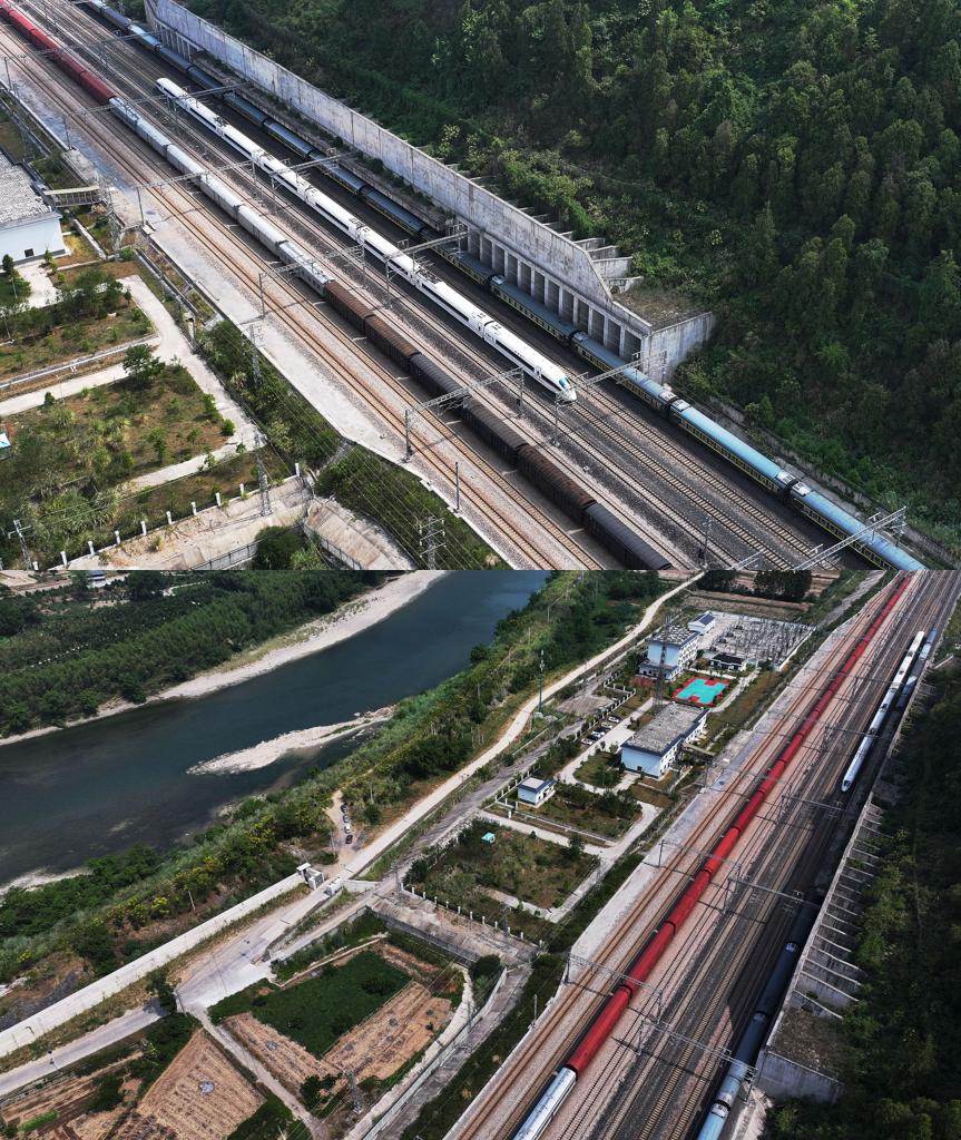 (拼版照片)上图:9月19日,高铁列车驶出渝厦高铁黔常段隧道,进入禾家村站。(无人机照片)下图:9月19日,一列普快列车驶出禾家村站。(无人机照片)新华社记者赵众志 摄