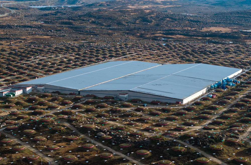 ↑这是9月20日拍摄的蓝色箱体为主体的广角切伦科夫望远镜阵列。新华社记者 江宏景 摄
