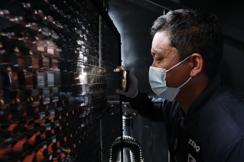 ↑9月20日,“拉索”工作人员在一台广角切伦科夫望远镜上检查成像部件。新华社记者 金立旺 摄