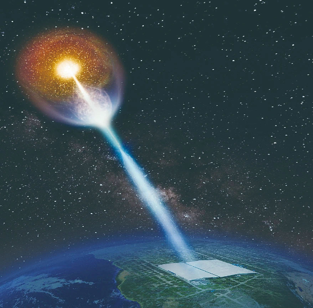 ↑“拉索”探测伽马射线暴(GRB 221009A)艺术图。中国科学院高能物理所供图