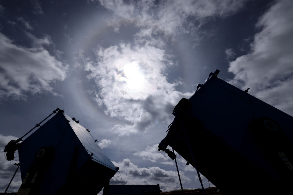 ↑2023年4月22日,广角切伦科夫望远镜上空出现日晕。新华社记者 金立旺 摄