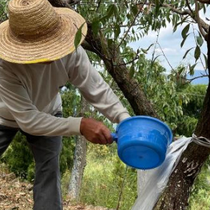 9月22日上午,马岭村种植大户李苏桂和丈夫在山坡上浇灌脆李树。丈夫提水管,李苏桂用锄头拢杂草,盖在树坑上,减缓水的蒸发。“前天才浇过这棵树,又干了。”李苏桂刨着土说。