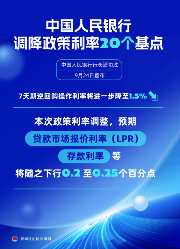 新华社北京9月24日电(记者吴雨、刘慧)中国人民银行行长潘功胜24日宣布,7天期逆回购操作利率将进一步降至1.5%。本次政策利率调整,预期贷款市场报价利率(LPR)、存款利率等将随之下行0.2个至0.25个百分点。