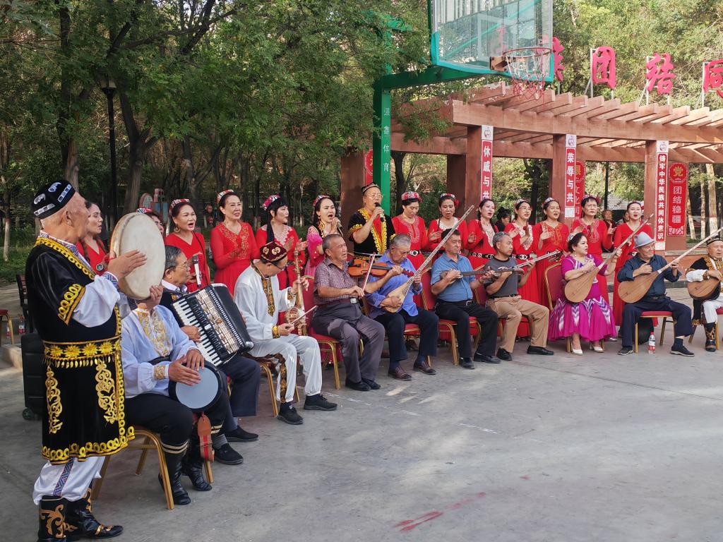 9月19日,库尔勒市朝阳街道团结社区“石榴籽艺术团”正在为居民们表演。新华社记者顾煜 摄