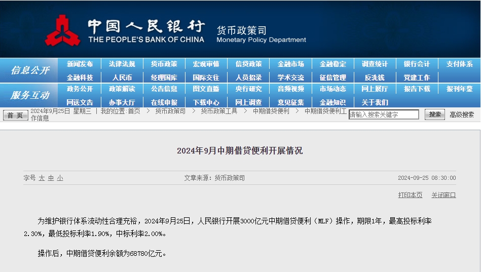新华社北京9月25日电(记者任军、吴雨)9月25日,中国人民银行发布了9月中期借贷便利(MLF)开展情况。当日中国人民银行开展3000亿元MLF操作,中标利率2%,较上月下行0.3个百分点。