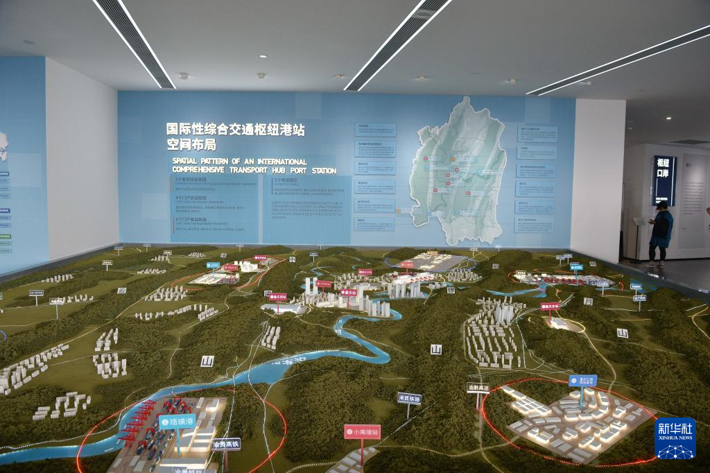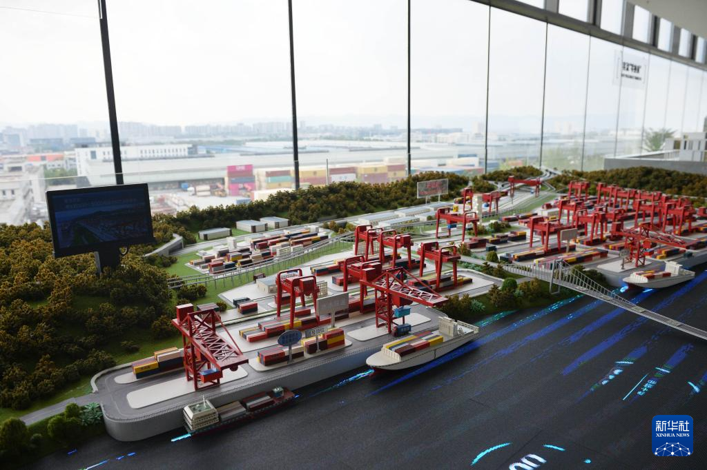 这是在重庆国际物流枢纽园区里的内陆国际物流枢纽展示中心拍摄的“果园港”模型(9月23日)。新华社记者 肖潇 摄