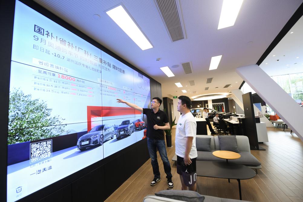 9月24日,在位于浙江省湖州市湖东街道的奥迪销售门店,工作人员向顾客介绍以旧换新补贴政策。新华社记者 翁忻旸 摄