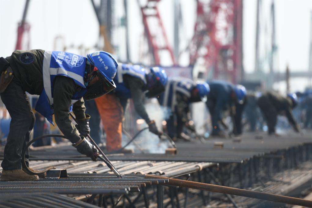 胡建国和工友们一起,把不同型号的钢筋抬放到简易工台上,连接拼装起来,为焊接作准备(9月12日摄)。