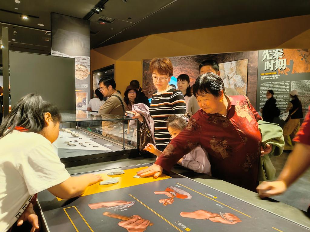 打制石器加工示意图旁,放置有原石和打制石器模型,观众可以亲手触摸体验二者区别;在编织品文物展台,观众排队体验手工编织工具,切身感受千年前古人如何编织衣物;丝绸之路展区,观众可以在绢马互市贸易互动游戏中扮演一名粟特商人,答题闯关,体验丝路经商的乐趣……
