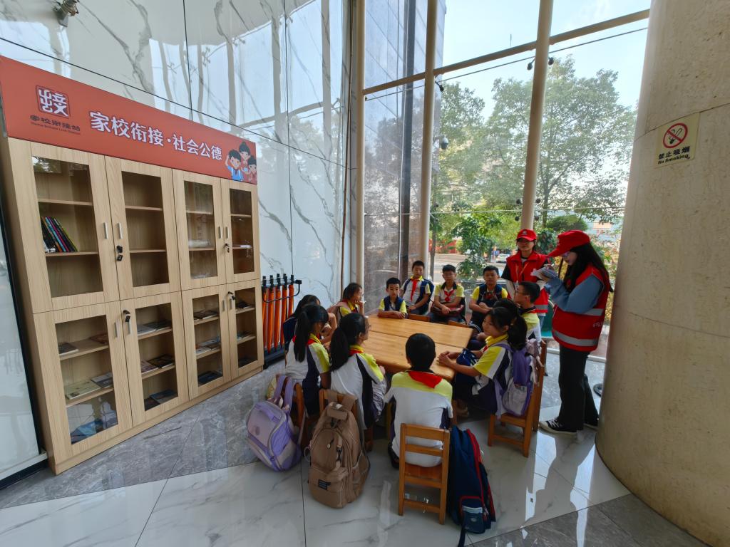 志愿者在“家校衔接站”照看放学的孩子。新华社记者周凯 摄
