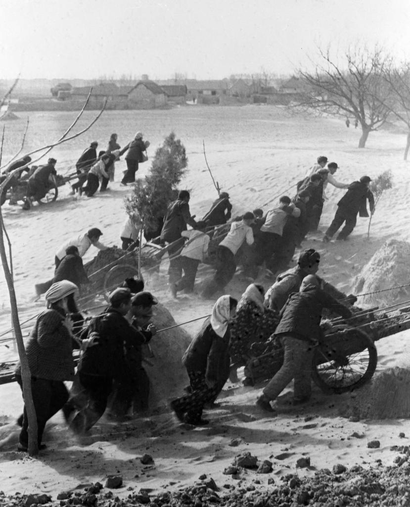 焦裕禄带领河南兰考干部群众治理风沙、内涝、盐碱“三害”,改变兰考面貌。这是兰考人民在运淤泥封住沙丘(1966年7月29日发)。新华社发