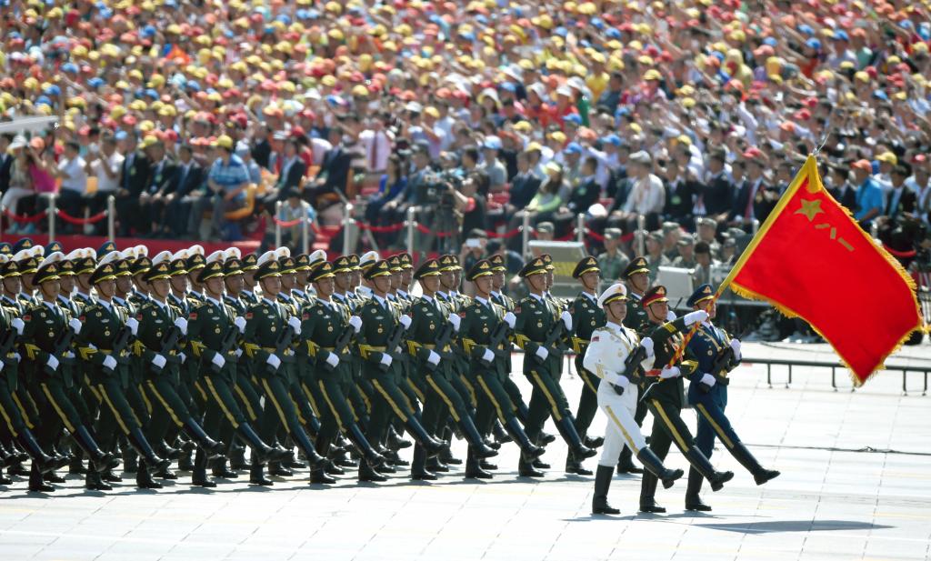 2015年9月3日,在北京举行的中国人民抗日战争暨世界反法西斯战争胜利70周年纪念大会上,中国人民解放军三军仪仗队方队通过天安门广场。新华社记者 王定昶 摄