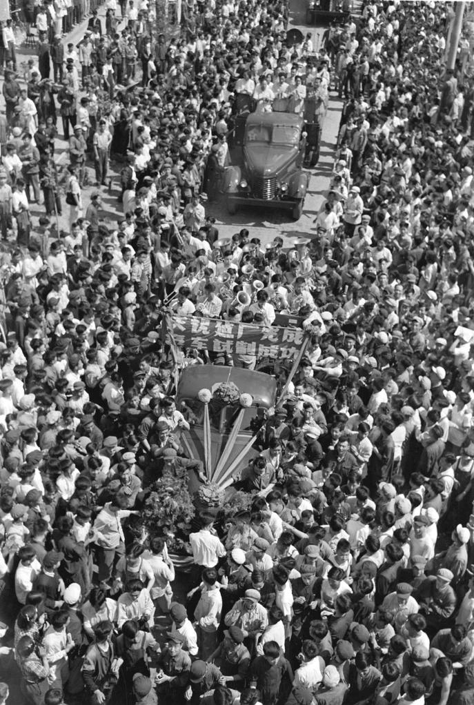 1956年7月14日,人们夹道欢迎第一汽车制造厂试制出的一批国产解放牌载重汽车。新华社记者 袁苓 摄