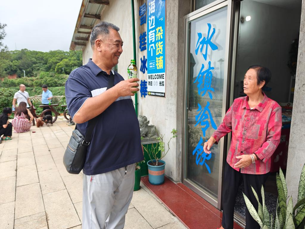 9月24日,马祖乡亲曹常斌(右二)在福州市连江县黄岐镇古石村杂货铺门口和村民聊天。新华社记者 许雪毅 摄