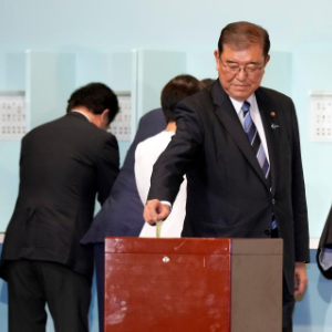 9月27日,石破茂(前)在日本东京自民党总部进行的自民党总裁选举中投票。 新华社发(Pool图片,小前博行摄)